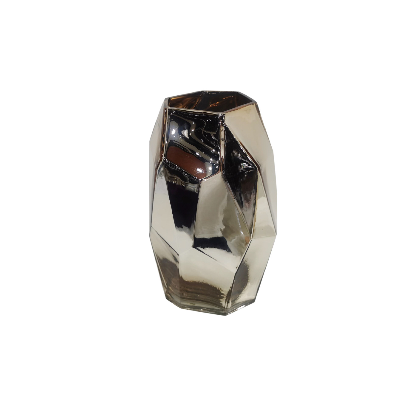 Este jarrón de vidrio con acabado espejado en tonos dorados y ámbar es una obra de arte moderna. Su diseño geométrico facetado refleja la luz de manera sofisticada, creando un efecto visual impactante. Ideal para decorar espacios contemporáneos, salas elegantes o centros de mesa con un toque de lujo y glamour.