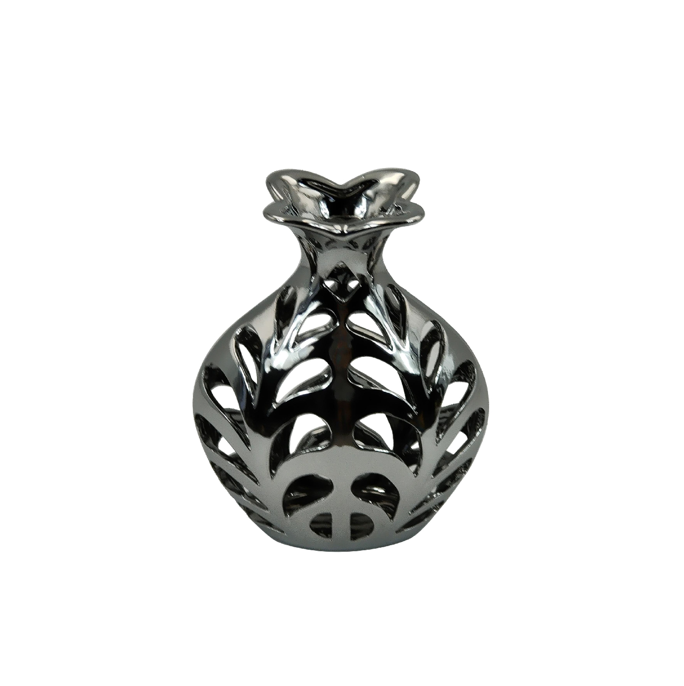Este sofisticado jarrón de cerámica con acabado metálico brillante presenta un diseño calado inspirado en formas orgánicas y geométricas. Su estructura abierta y fluida aporta un toque moderno y vanguardista, ideal para decorar espacios contemporáneos con elegancia y distinción.