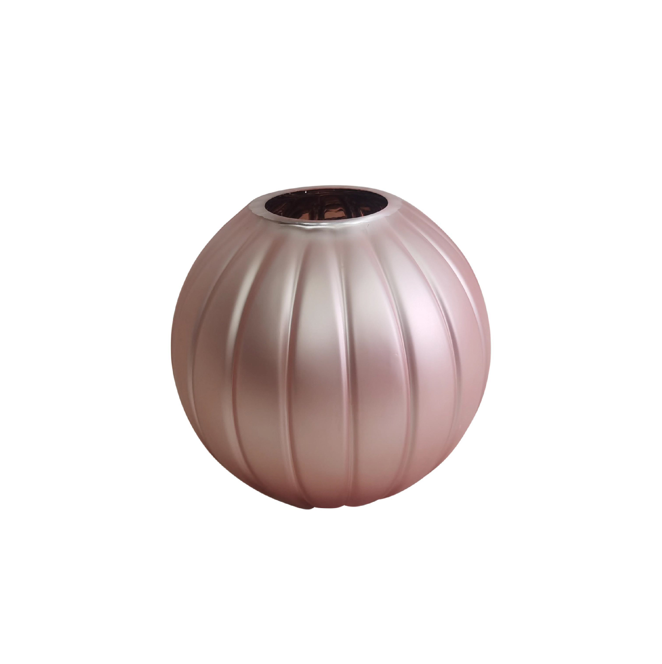 Jarrón esférico con acabado mate en tono rosa perlado y elegantes líneas verticales. Su diseño sofisticado y moderno lo convierte en una pieza ideal para realzar cualquier espacio con sutileza y estilo.